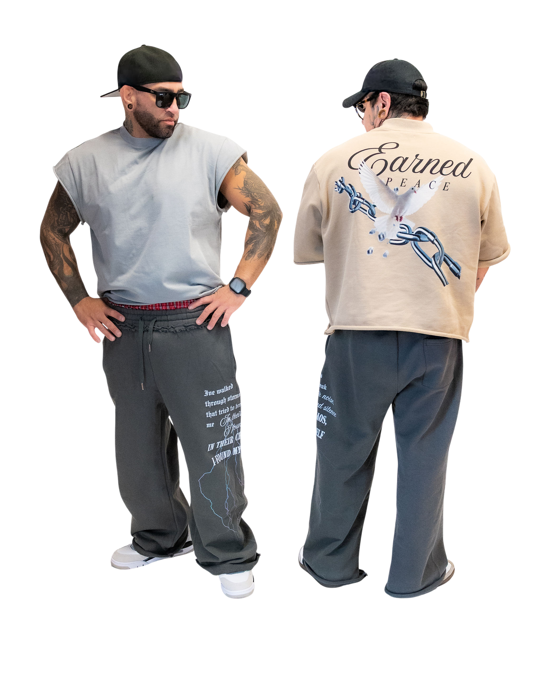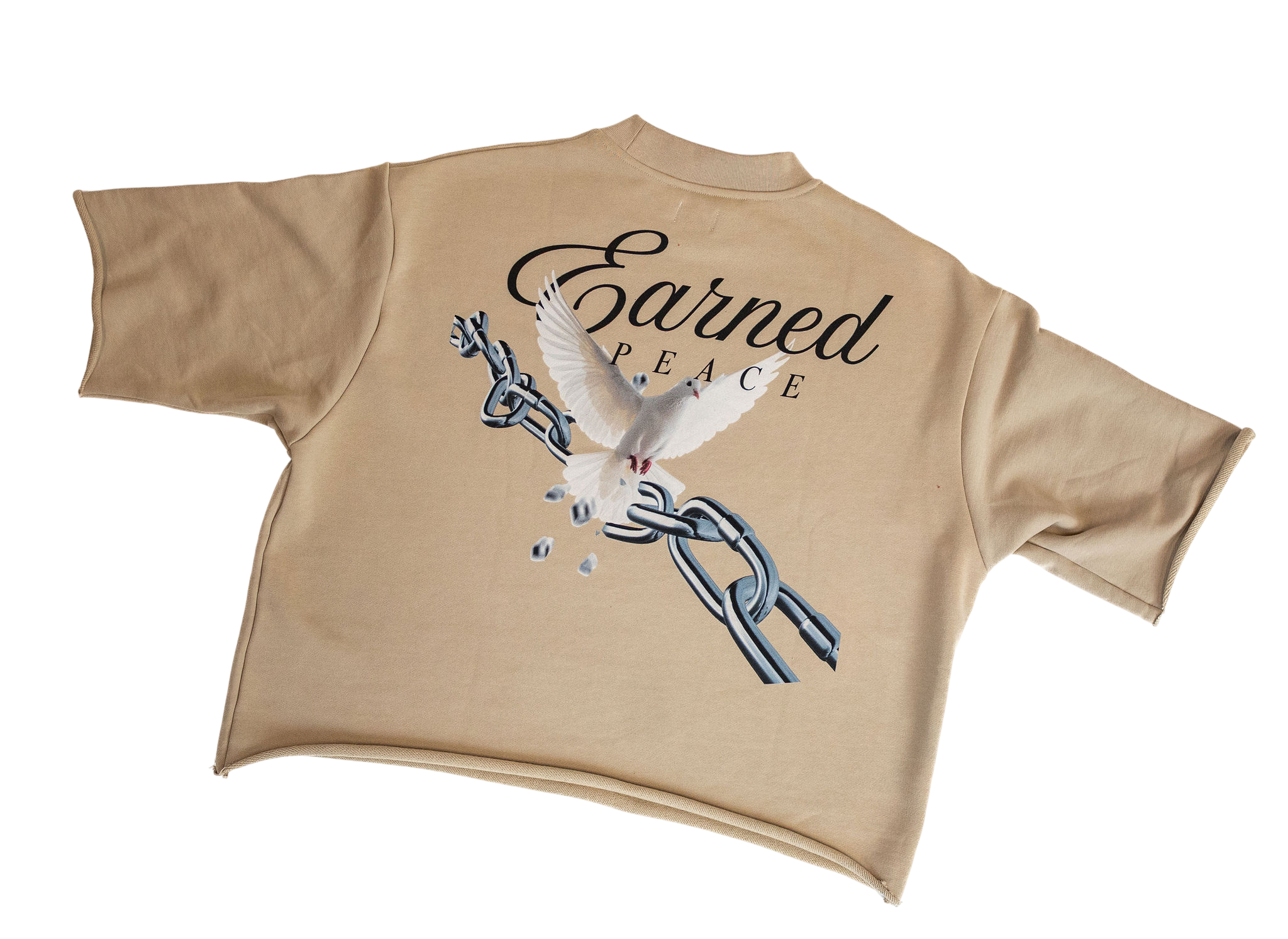 Crafted from 420 GSM French terry, it carries a heavyweight structure that drapes with intention. The cut-off hem at the waist and sleeves gives it a raw, unfinished edge — a reminder that peace isn’t polished, it’s earned.
